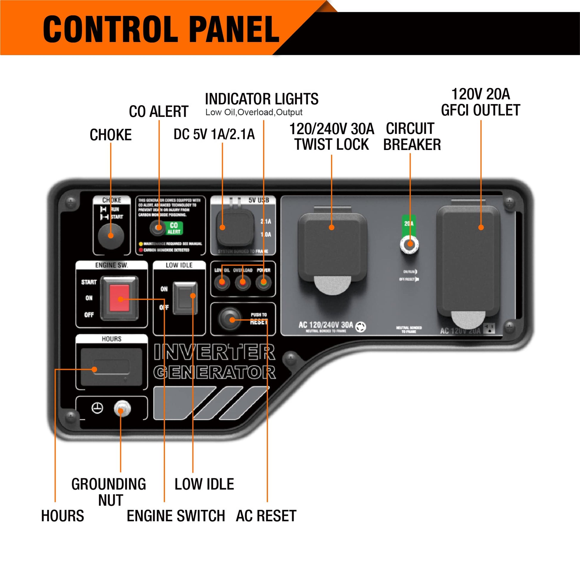 • 【Multi-Functional Panel】Hour meter and LED indicators alert you when unit is low on oil, overloaded or ready-to-use. The covered outlets in this inverter include a 120/240V 30A locking outlet (L14-30R), two 120V 20A GFCI protected household outlets (5-20R) and with a dual USB adapter.